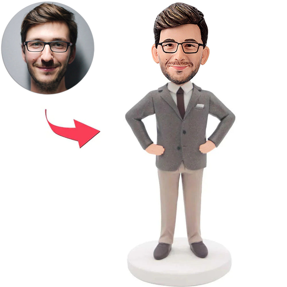 Geschäftsmann mit den Händen auf der Taille Kundenspezifische Bobbleheads fügen Text hinzu