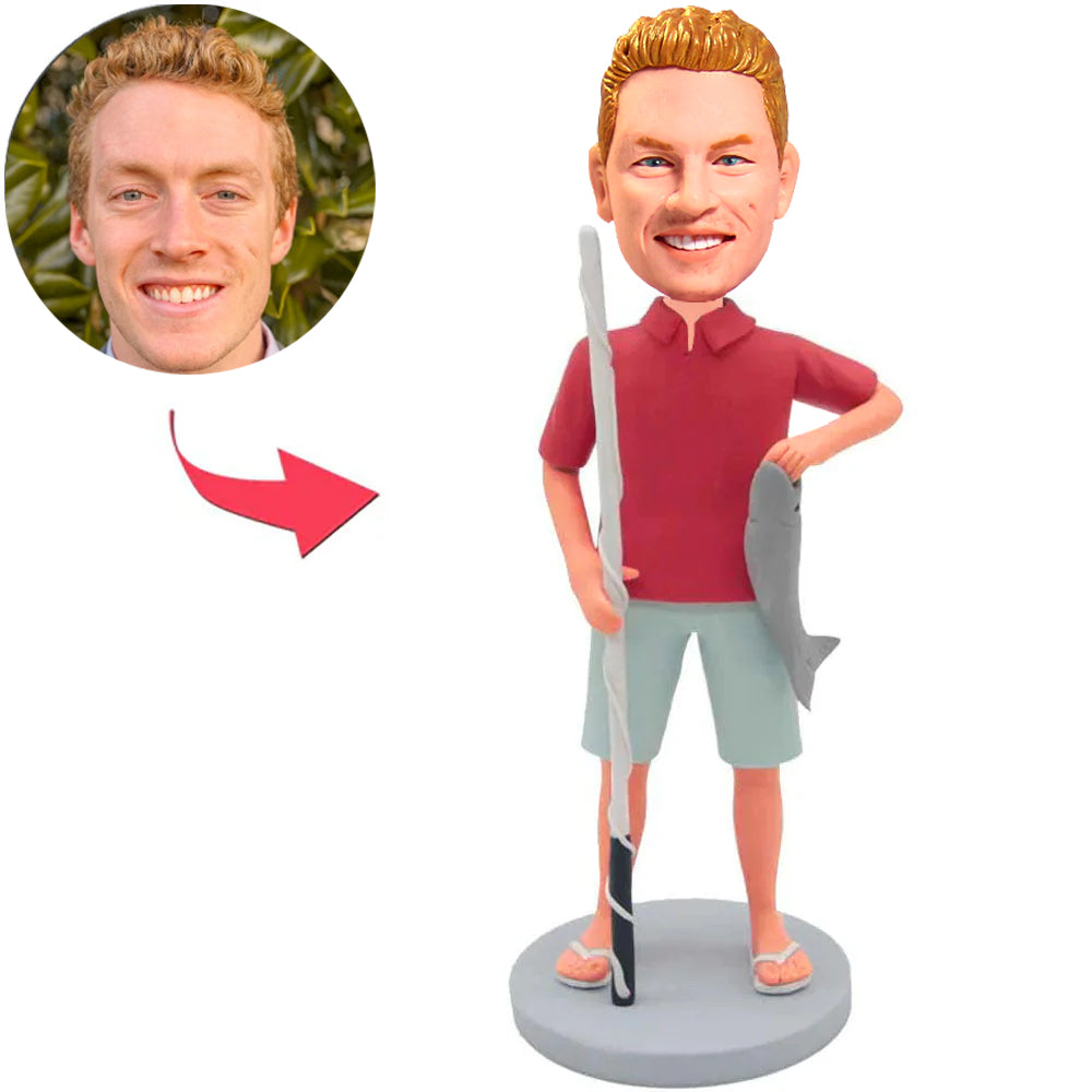 Zufälliger Mann, der kundenspezifische Bobbleheads fischt, addieren Text