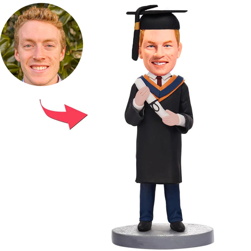 Maßgeschneiderter Abschlussmann mit Abschlusshut Kundenspezifische Bobbleheads fügen Text hinzu