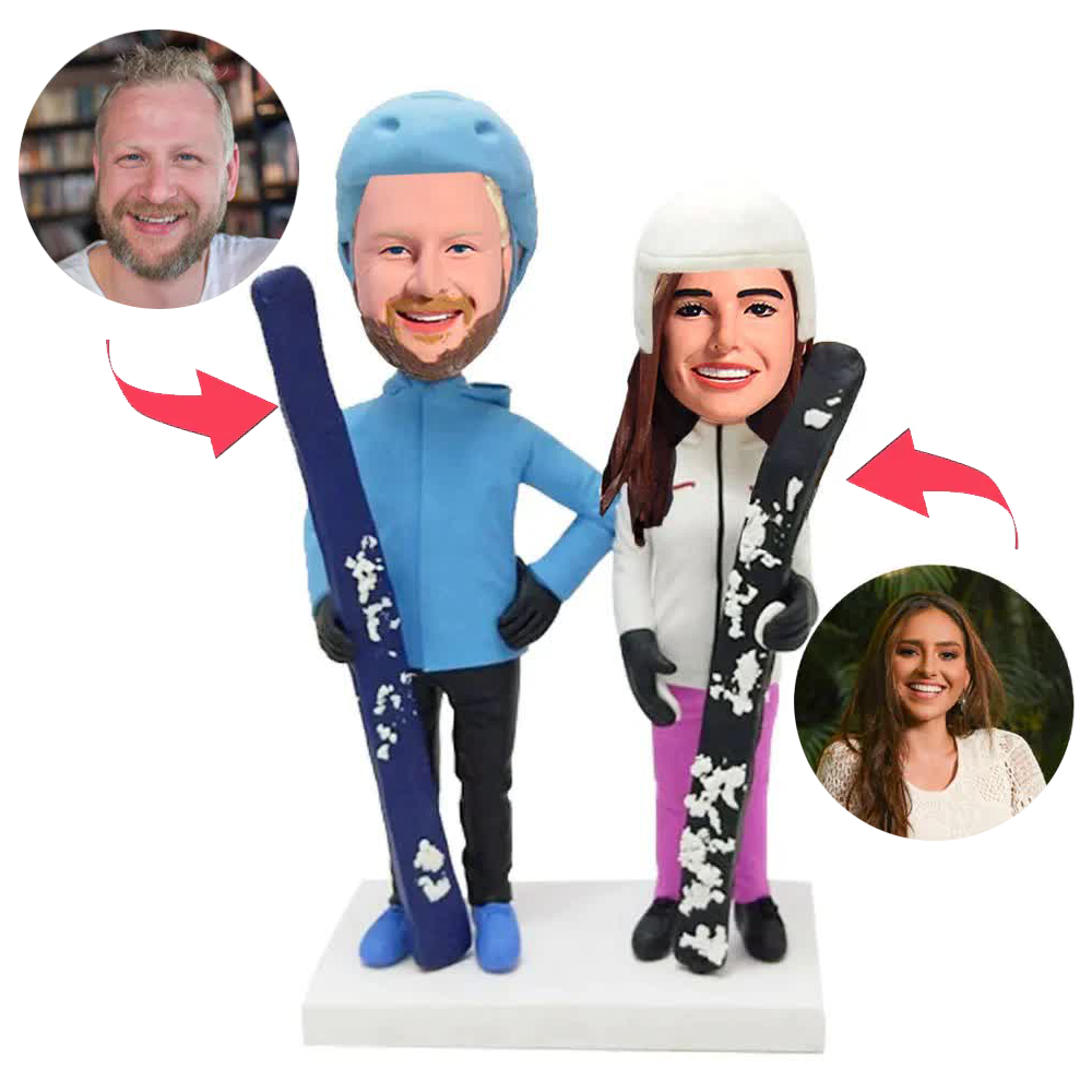Holding Skis Couple Custom Bobblehead With Engraved Text