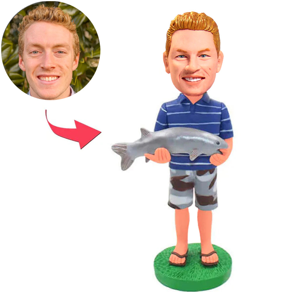 Mann, der große Fisch-kundenspezifische Bobbleheads hält, addieren Text